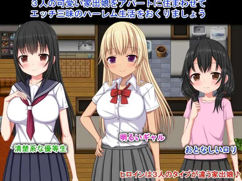女主角是三位不同类型的离家出走女孩。有43张基础CG!还有立绘。